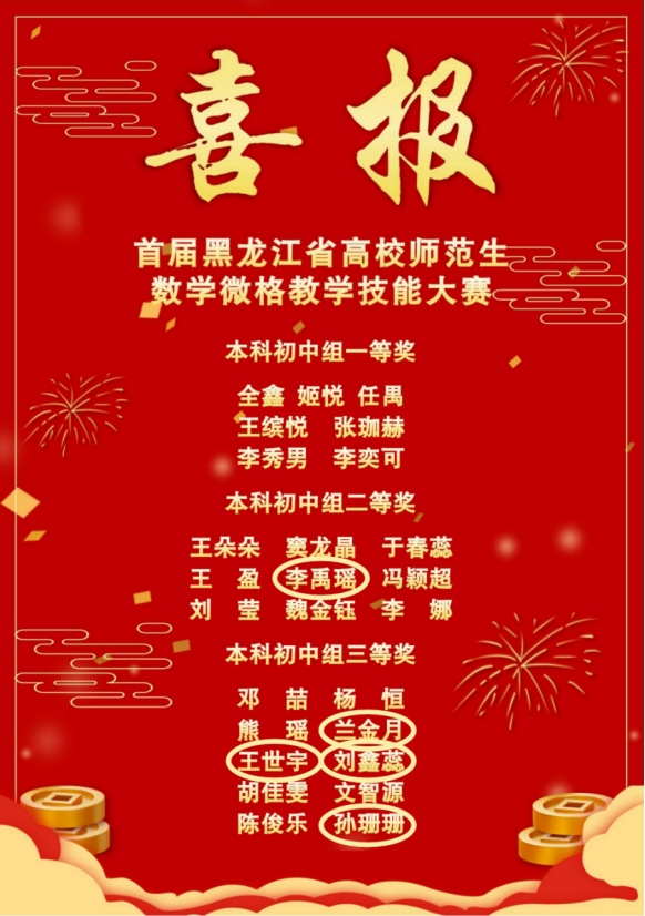 11月1日,首届黑龙江省高校师范生数学微格教学技能大赛落幕,我院蔡雨婷老师带队参赛,获得多项荣誉。李禹瑶荣获本科初中组二等奖;兰金月、王世宇、刘鑫蕊、孙珊珊荣获本科初中组三等奖。